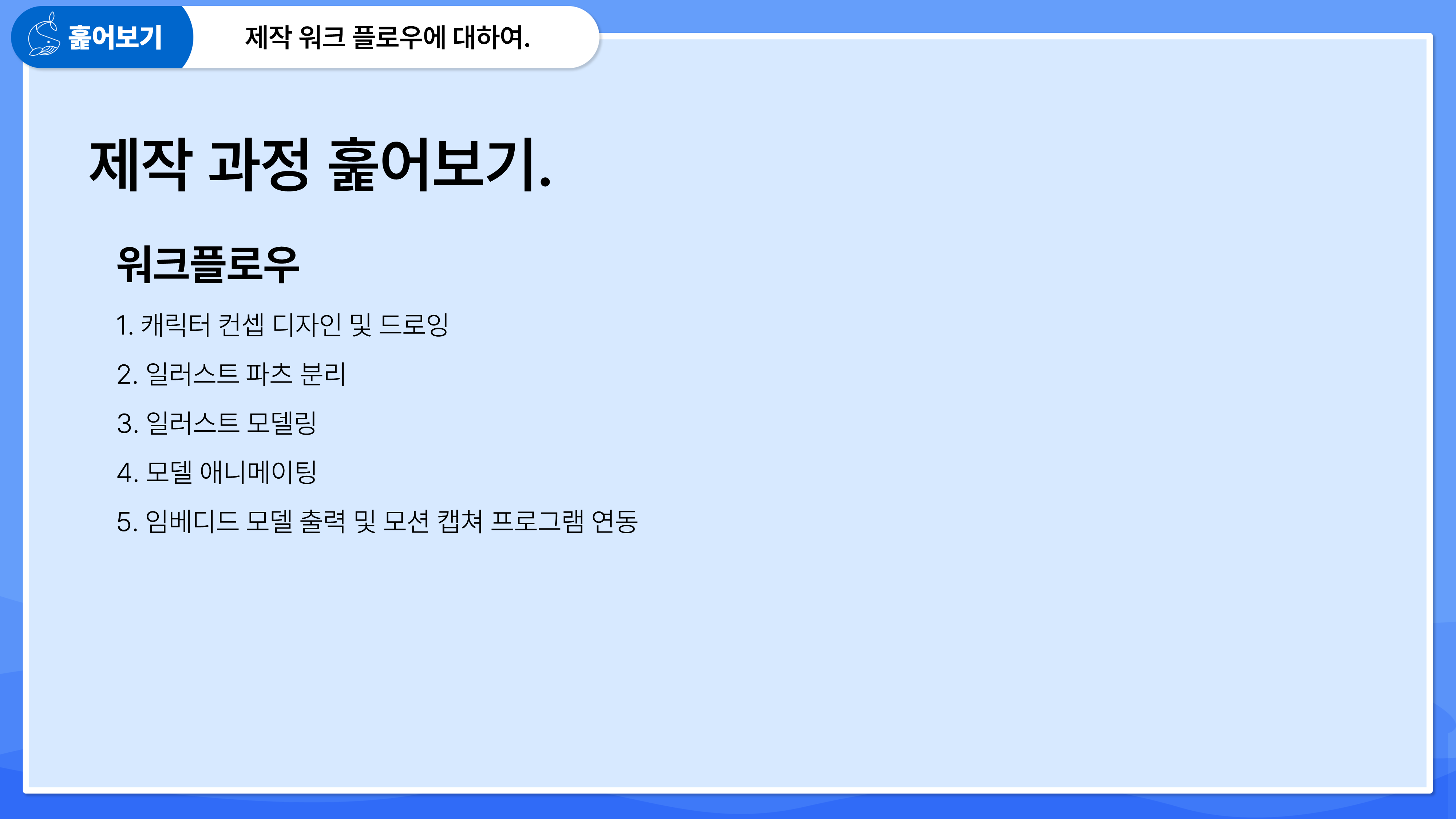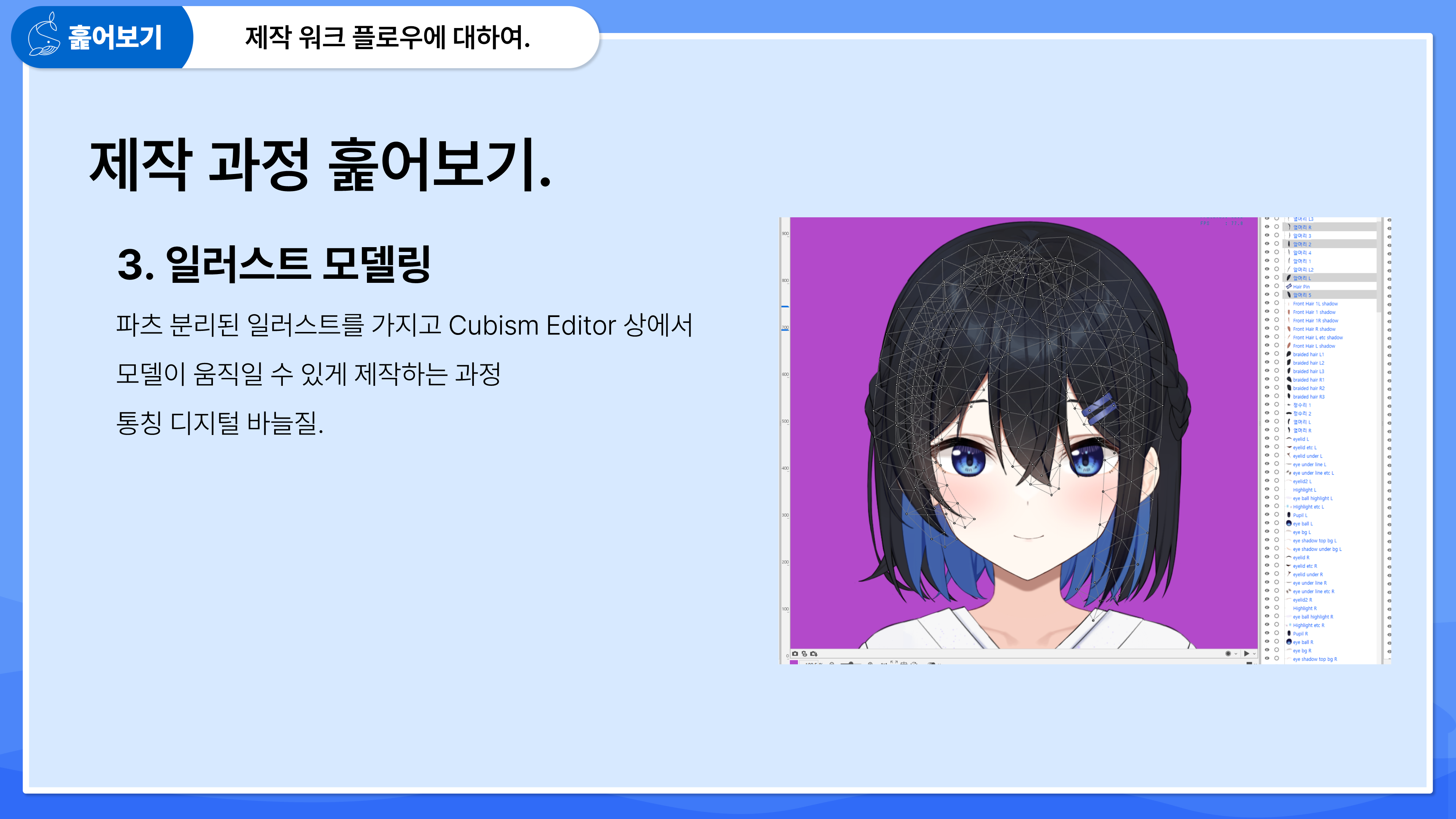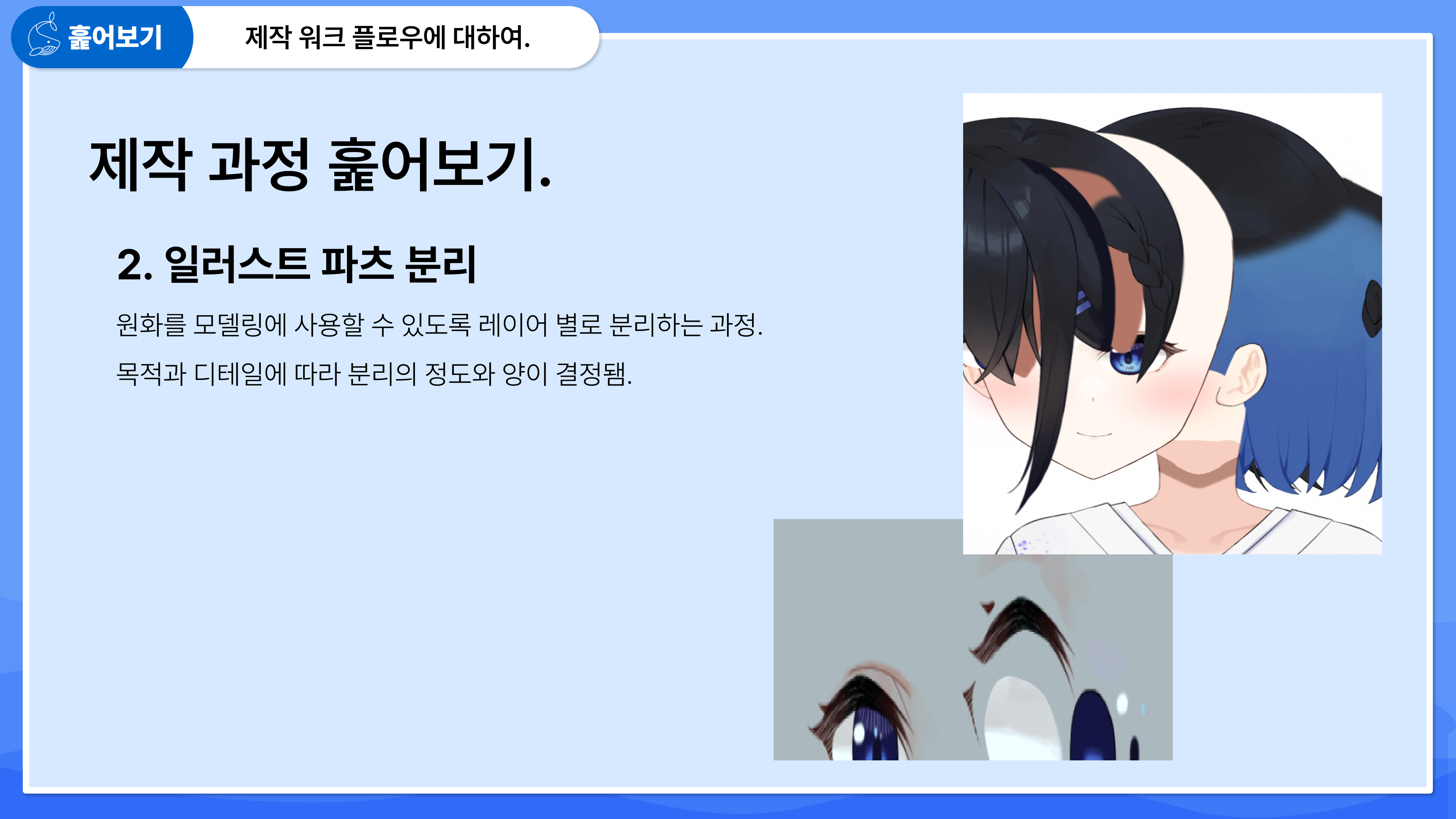 여러분들이 흔히 접하실 수 있는 2D 기반의 버추얼 스트리머들의 아바타들이 어떠한 과정을 거쳐 제작되는지 워크 플로우를 한번 훑어보고 가보겠습니다. 여러분들이 입문하기에 대략적인 흐름을 잡기에 도움이 될 꺼라 생각합니다.
