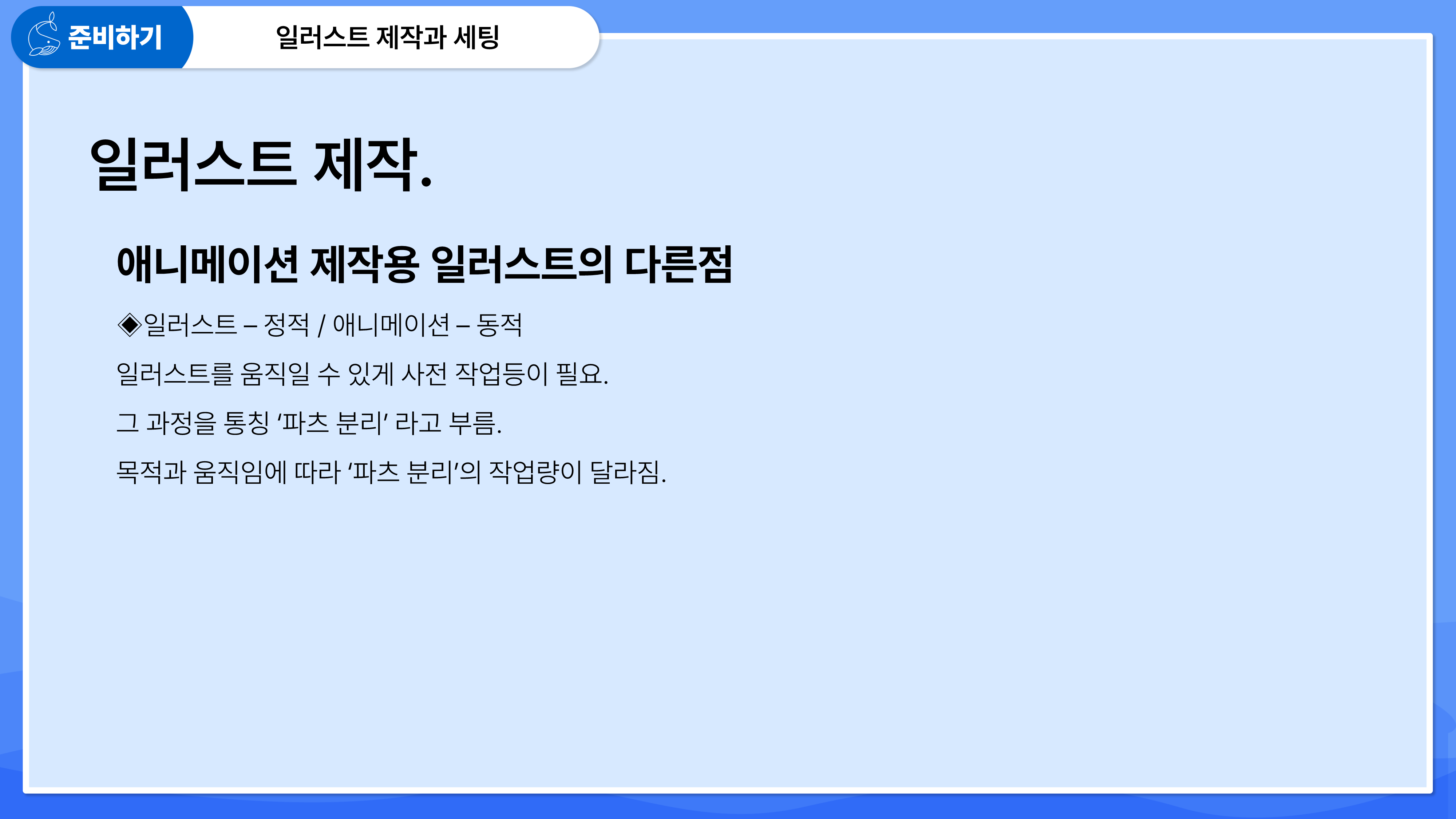 애니메이션용 일러스트는 일반 일러스트와 어떤 차이점이 있는지 일러스트 세팅 시 어떤 주의사항이 있는지 알아보도록 합시다.
