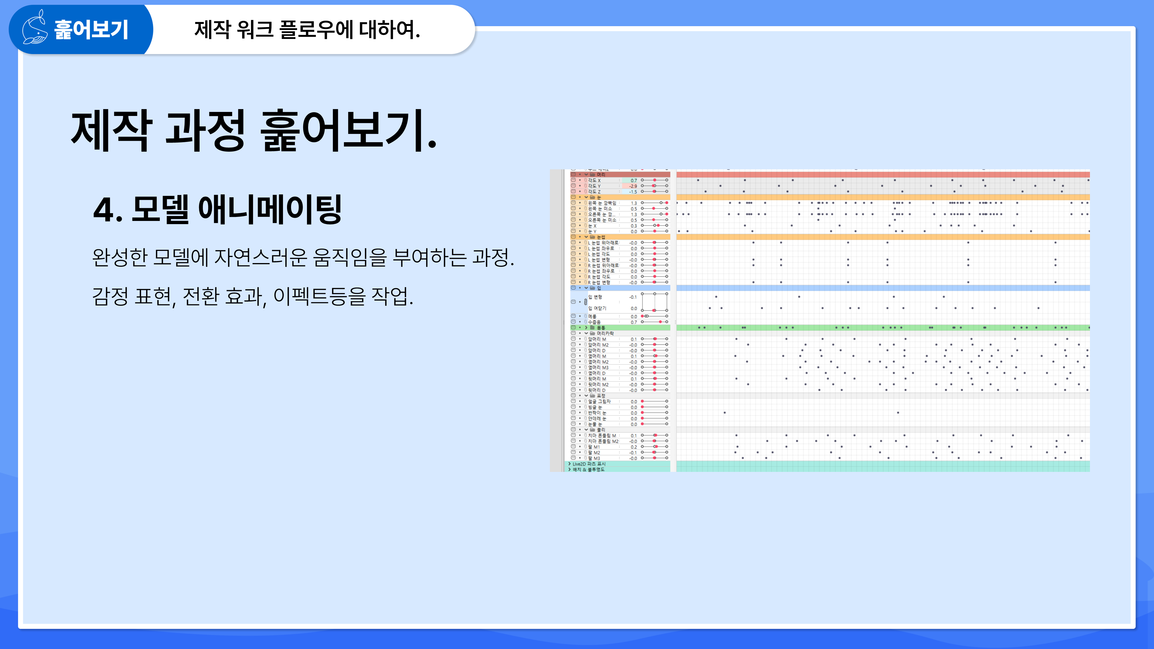 모델링 과정에서 제작한 수십 수백 개의 파라미터를 이용하여 캐릭터에게 적절한 움직임을 부여하는 과정입니다. 버추얼 모델을 제작하는 과정에선 애니메이팅의 비중이 그렇게 엄청 높은 편은 아니지만 예쁜 움직임을 위해선 Live2D 작업자의 손을 필요로 합니다.