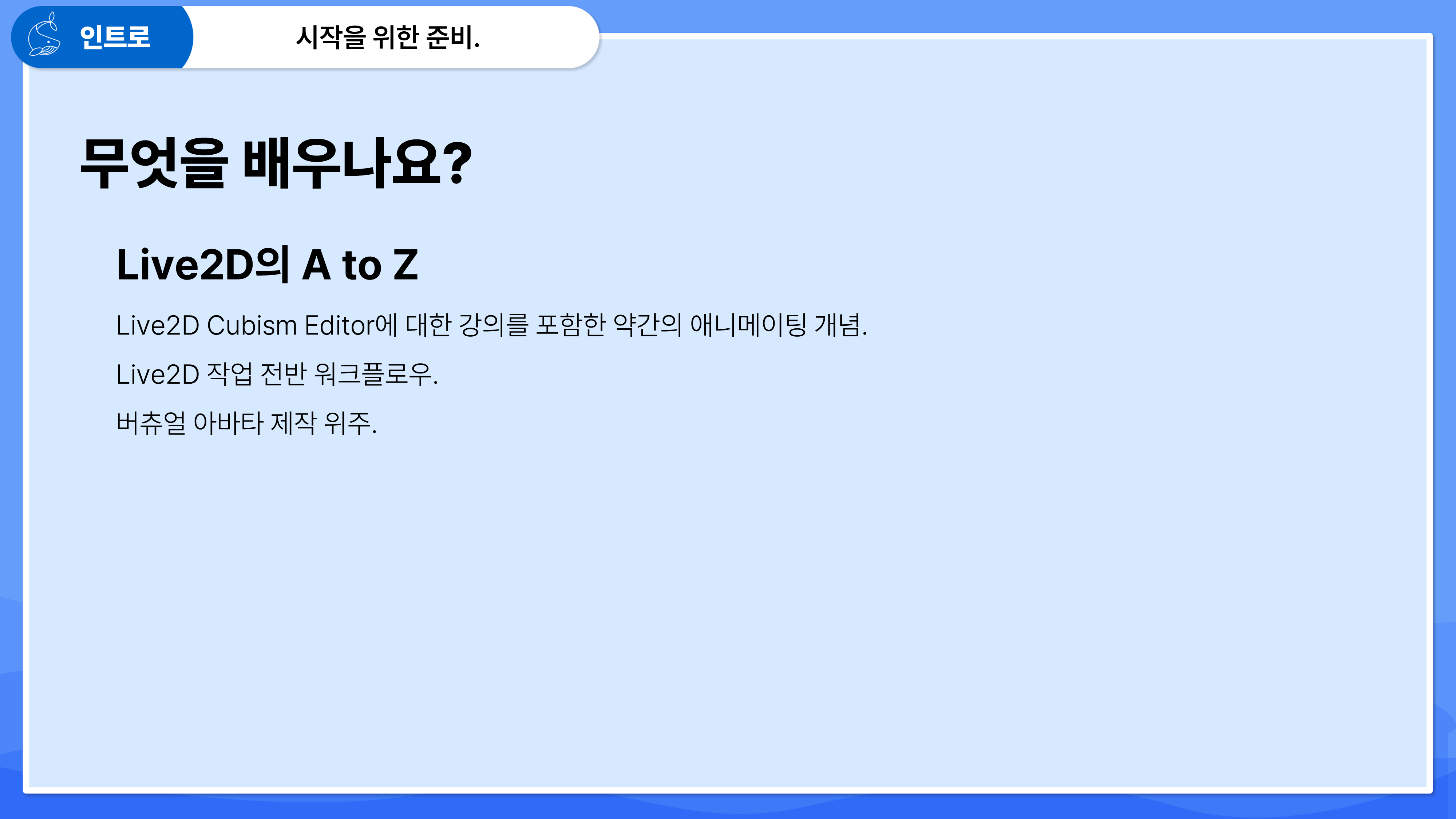 Live2D Cubism Editor에 대한 강의를 비롯해 기본적인 애니메이팅 개념도 같이 파악할 수 있는 강의를 진행하는 게 주 목표입니다.