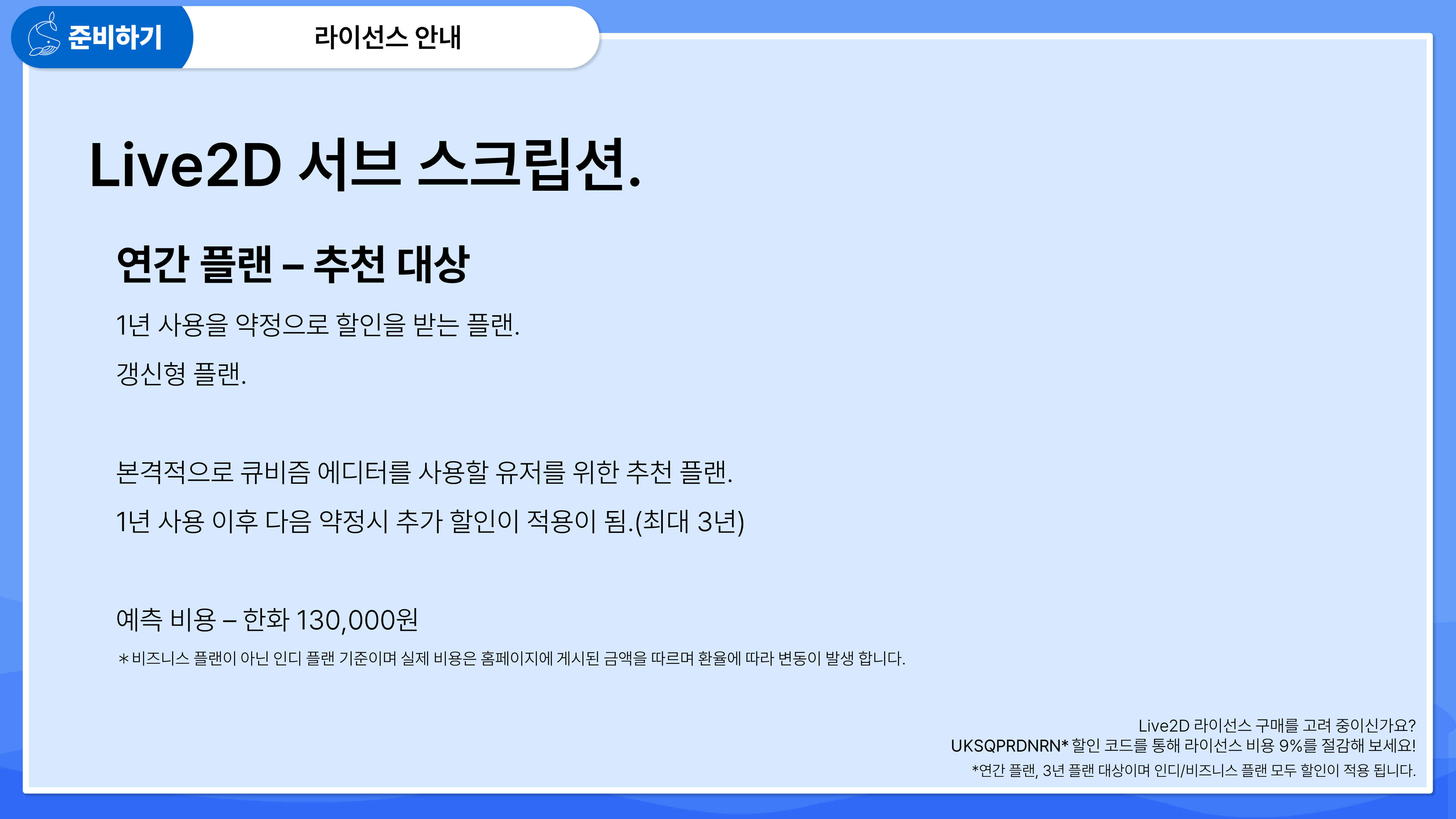 연간 플랜에 포함되어 있는 할인이 미리 반영된 플랜이며 장기간 Cubism Editor 사용이 확정된 사용바들에게 추천하는 플랜입니다.