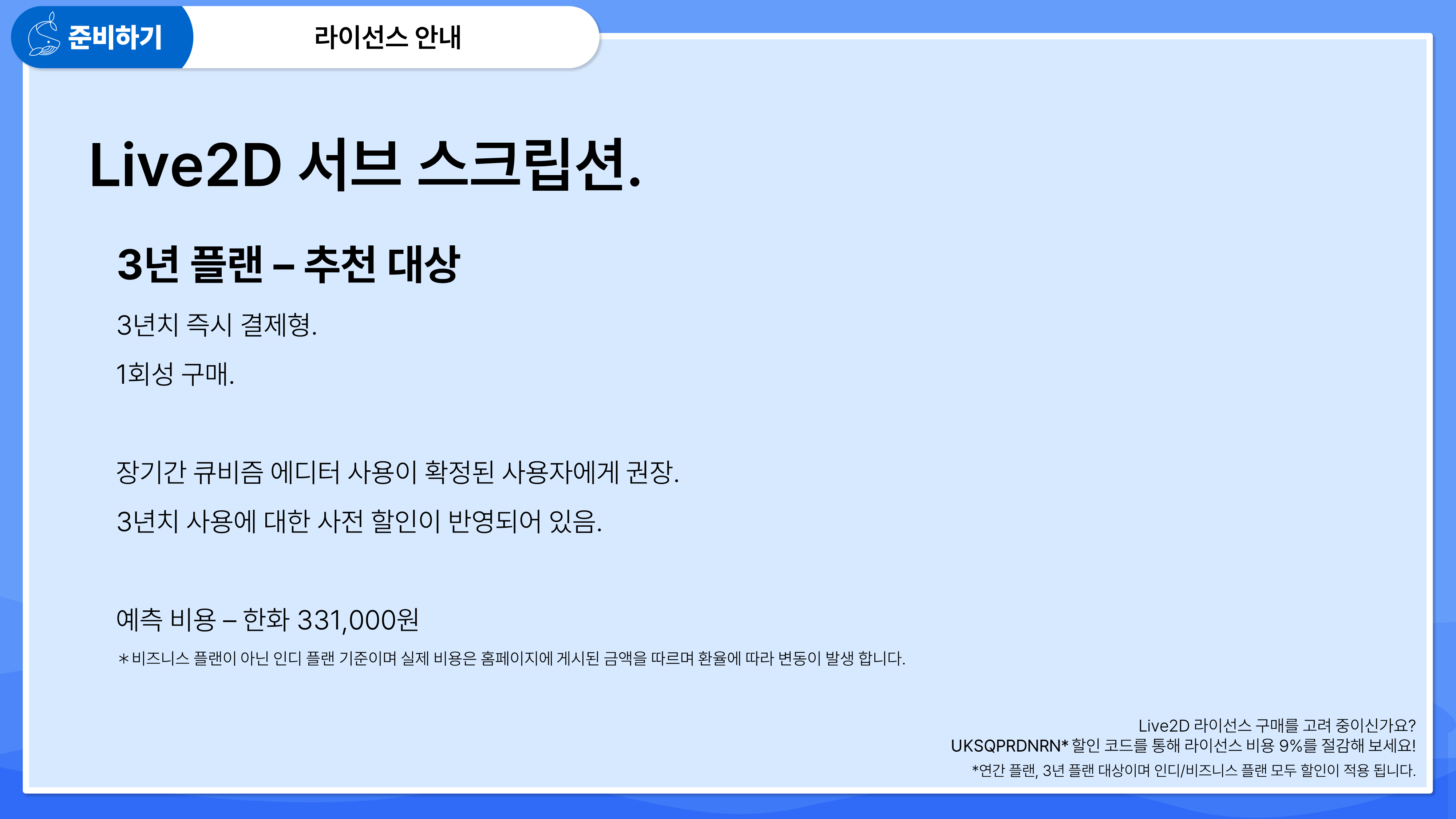연간 플랜에 포함되어 있는 할인이 미리 반영된 플랜이며 장기간 Cubism Editor 사용이 확정된 사용바들에게 추천하는 플랜입니다.