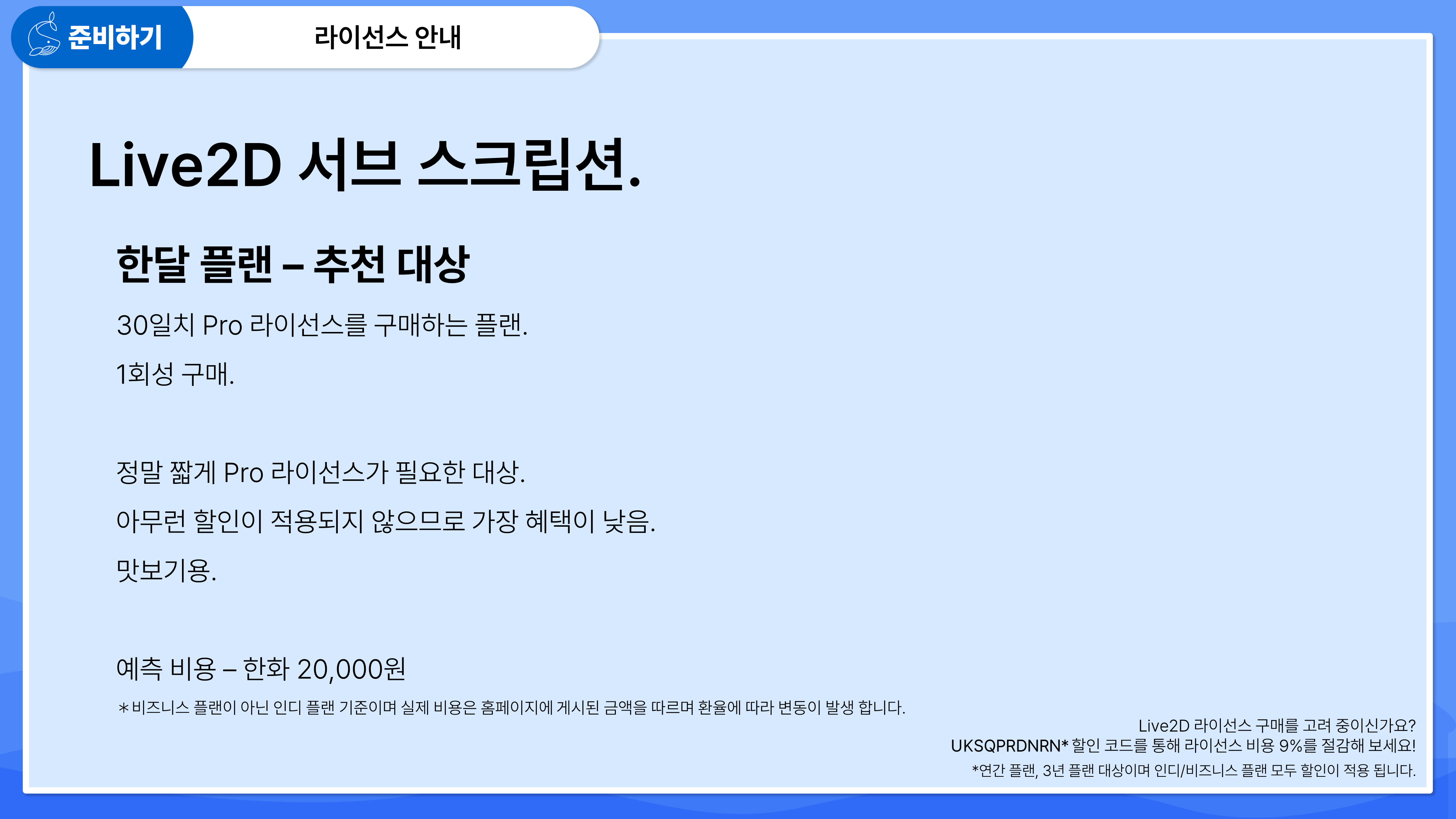 Live2D는 필요와 목적에 맞게 다양한 라이선스를 택 할 수 있습니다.