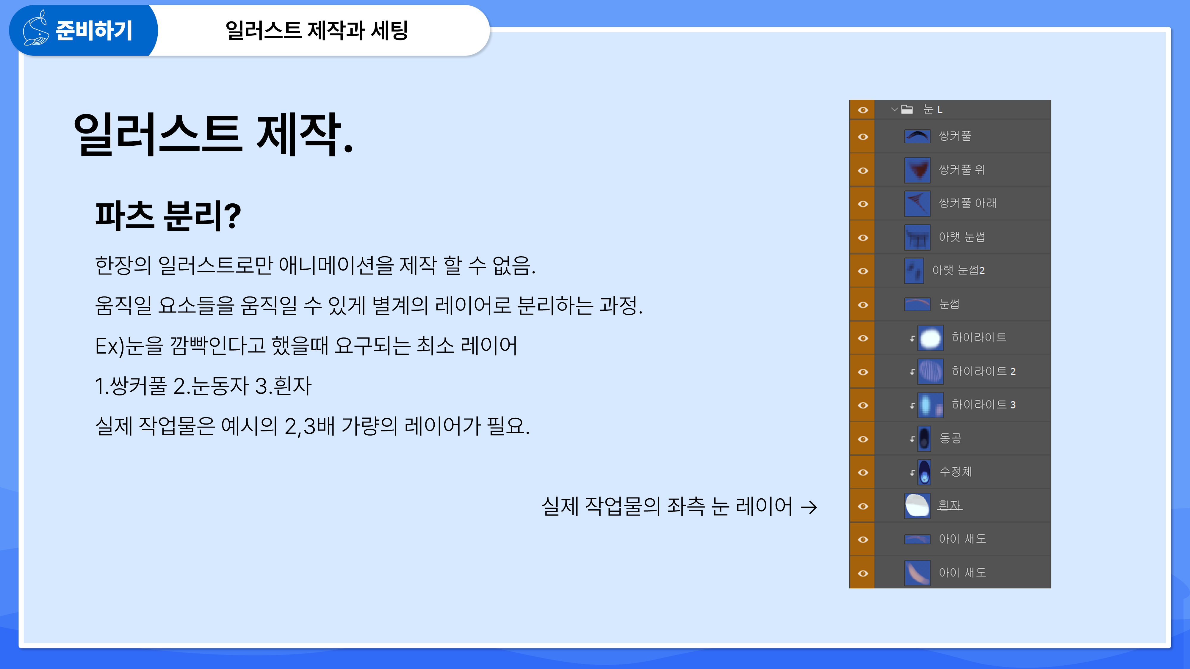 그걸 애니메이팅으로 표현하기 위해서 눈꺼풀, 쌍꺼풀, 눈썹, 살갗등 각각의 부위별로 파츠 분리를 한다고 보시면 됩니다.