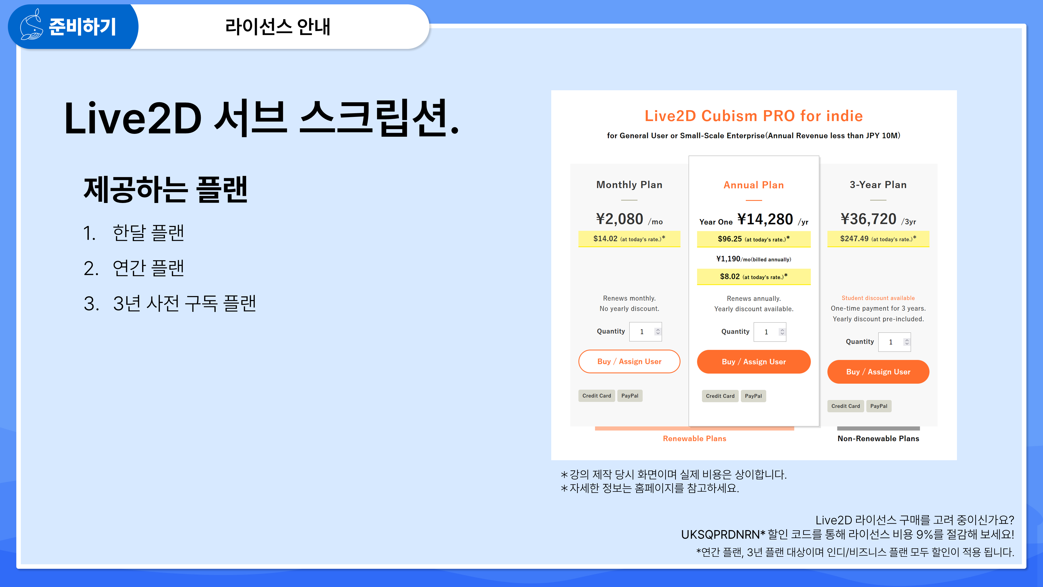 Live2D는 구독형 프로그램이며 사용 규모나 수익 등에 따라 인디 혹은 비즈니스등으로 나뉘게 됩니다.