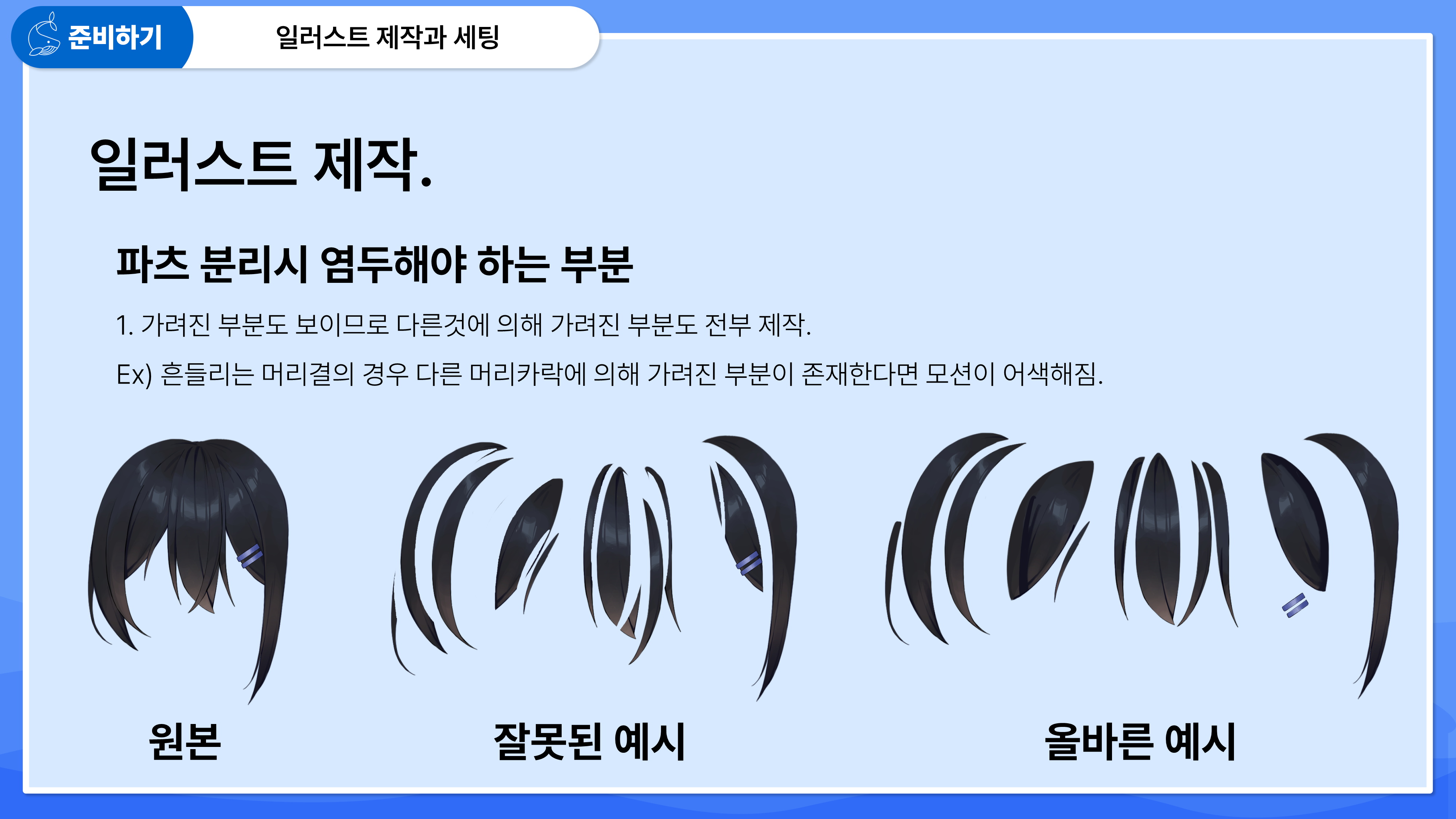 여기서 만약에 멈춰있던 현재의 머리카락 모습(원본)을 기준으로 우리 눈에 보이는 부분 그대로 파츠를 분리(잘못된 예시)하게 된다면 머리카락이 움직이는 그 순간 빈 여백등이 드러나게 될 겁니다.