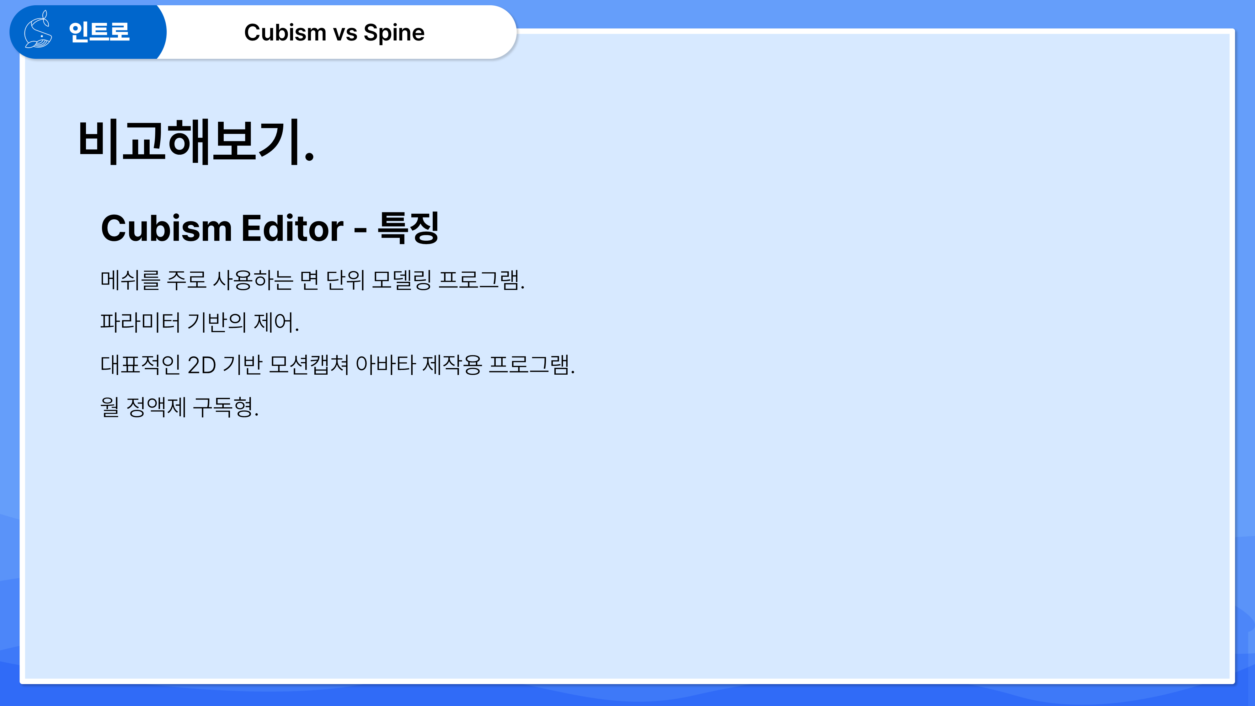 2D 애니메이팅 솔루션은 다양한 방법이 있지만 대표적으로는 이번 강의에서 알려드리는 Live2D Cubism 와 Spine2D가 있습니다.