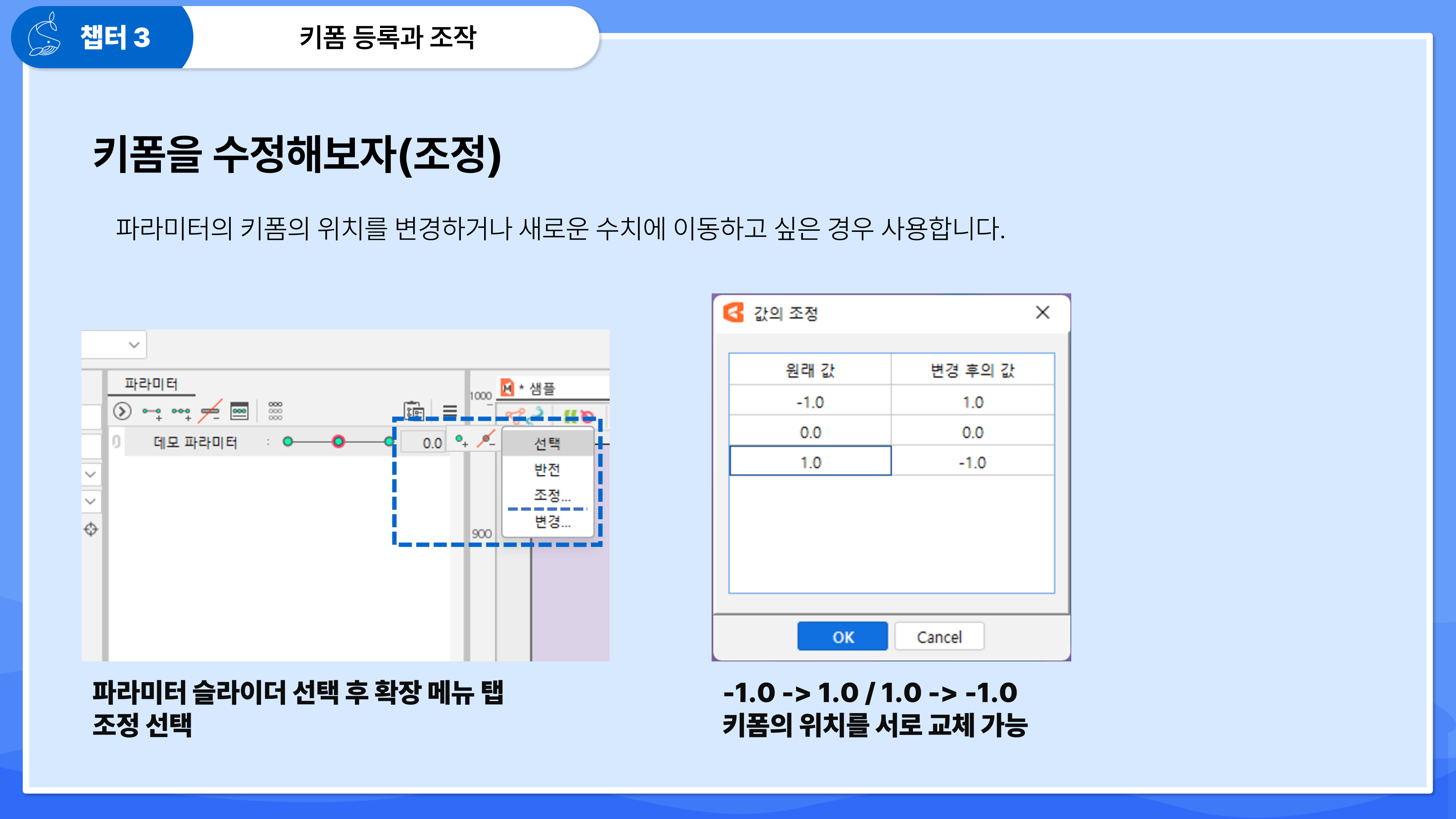 파라미터의 키폼의 값끼리 교체해야 하는 경우 사용하는 조정 기능입니다.