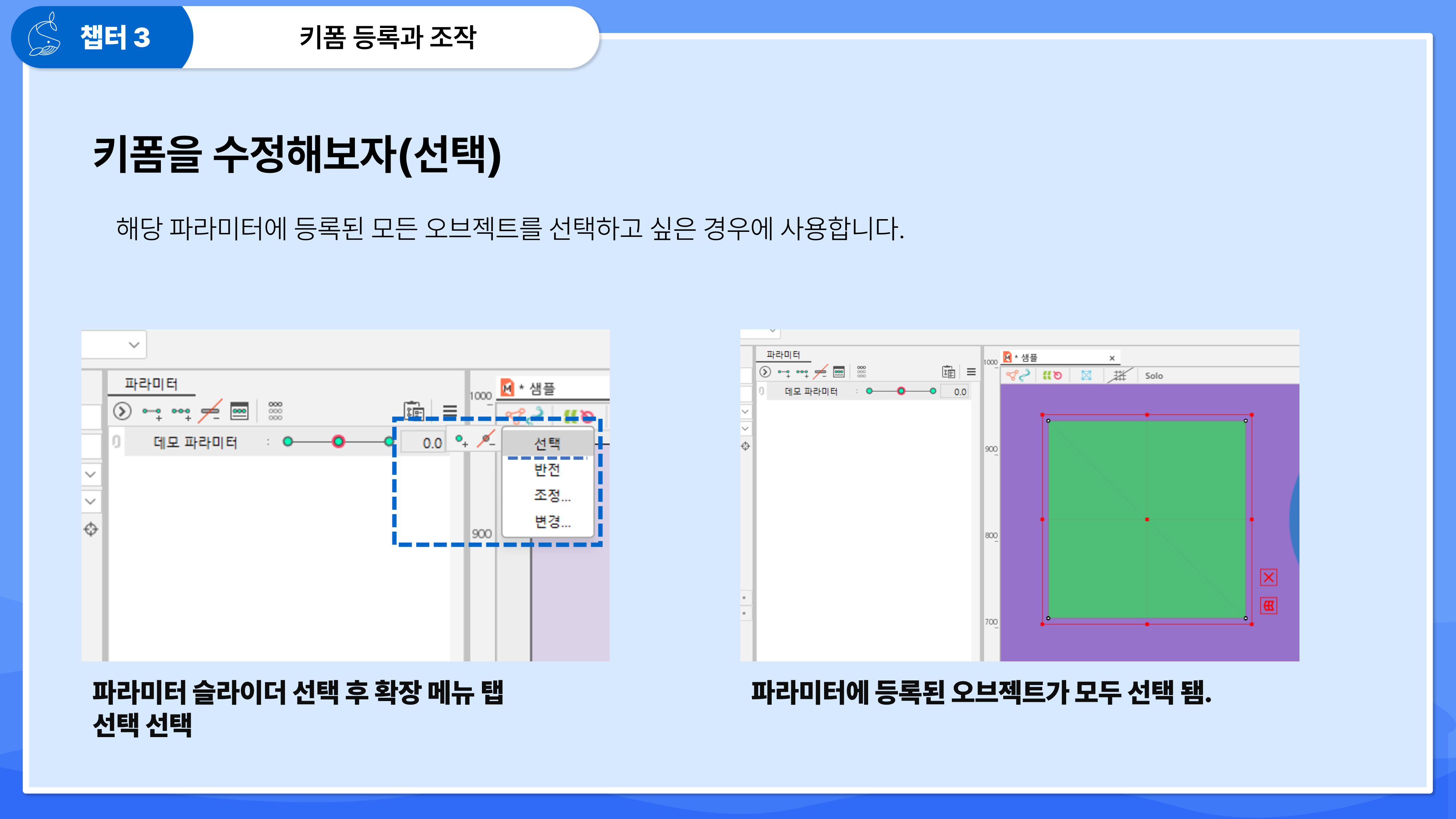 선택된 파라미터의 키폼에 등록된 오브젝트를 일괄적으로 선택할 수 있는 선택 기능입니다.