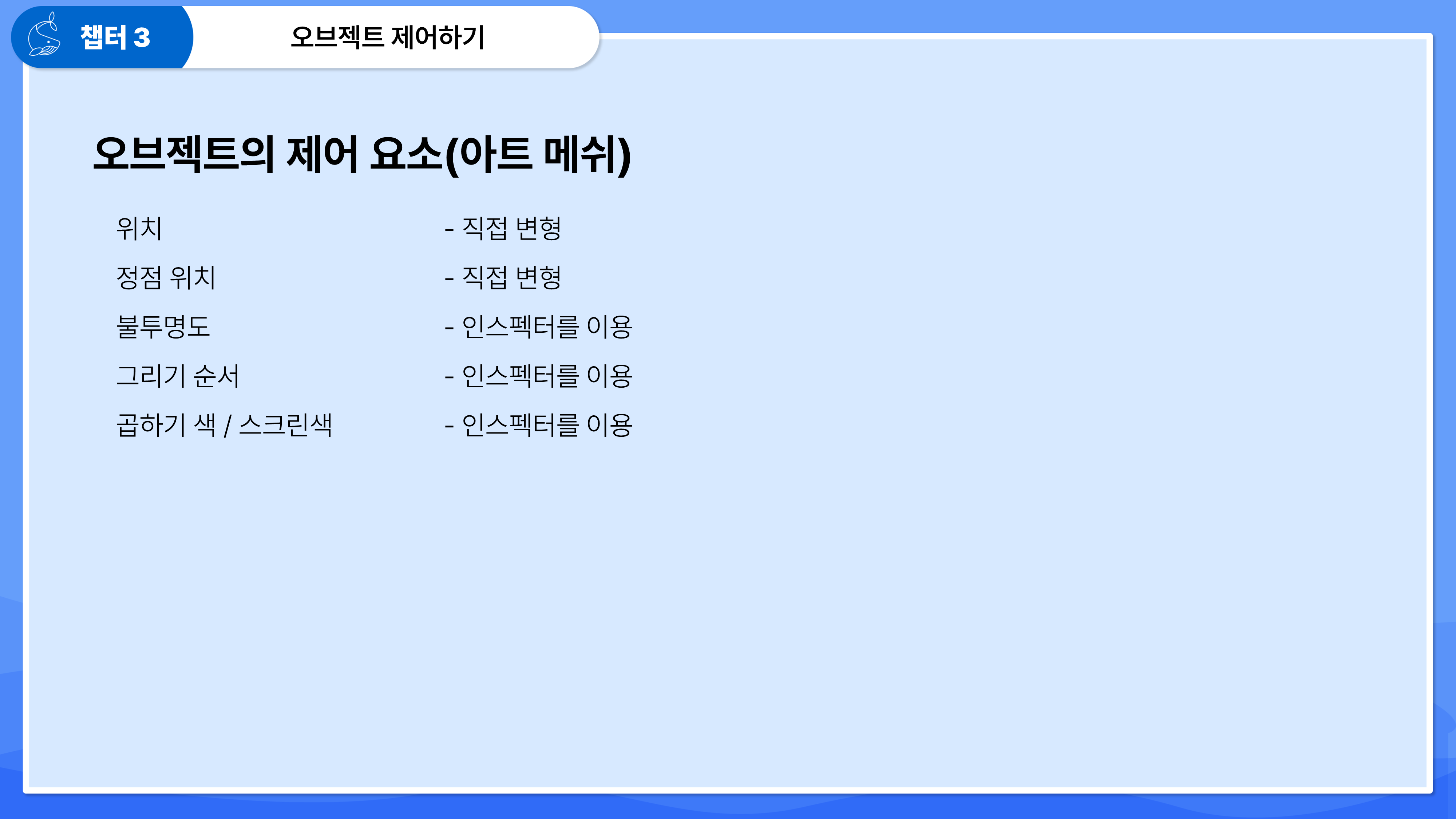 해당 오브젝트를 선택했을때 나오는 인스펙터 팔레트에서 제어가 가능한 요소가 있으므로 어떤 요소가 인스펙터에서 제어 가능한지 참고하시면 될 것 같습니다.