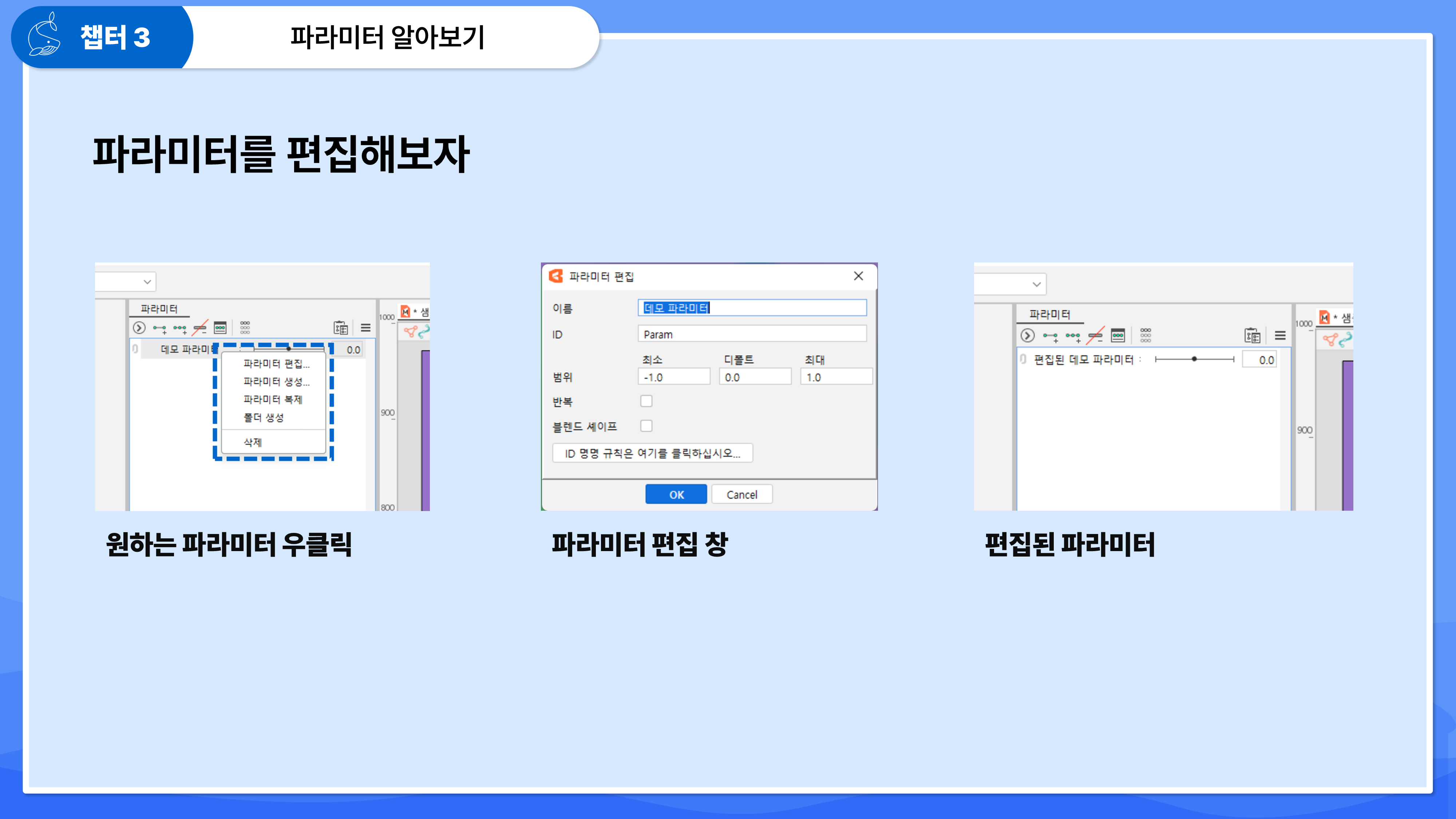 파라미터 편집 창에 뜨면 여기서 여러분들이 원하시는 파라미터의 구성요소를 편집할 수 있습니다.
