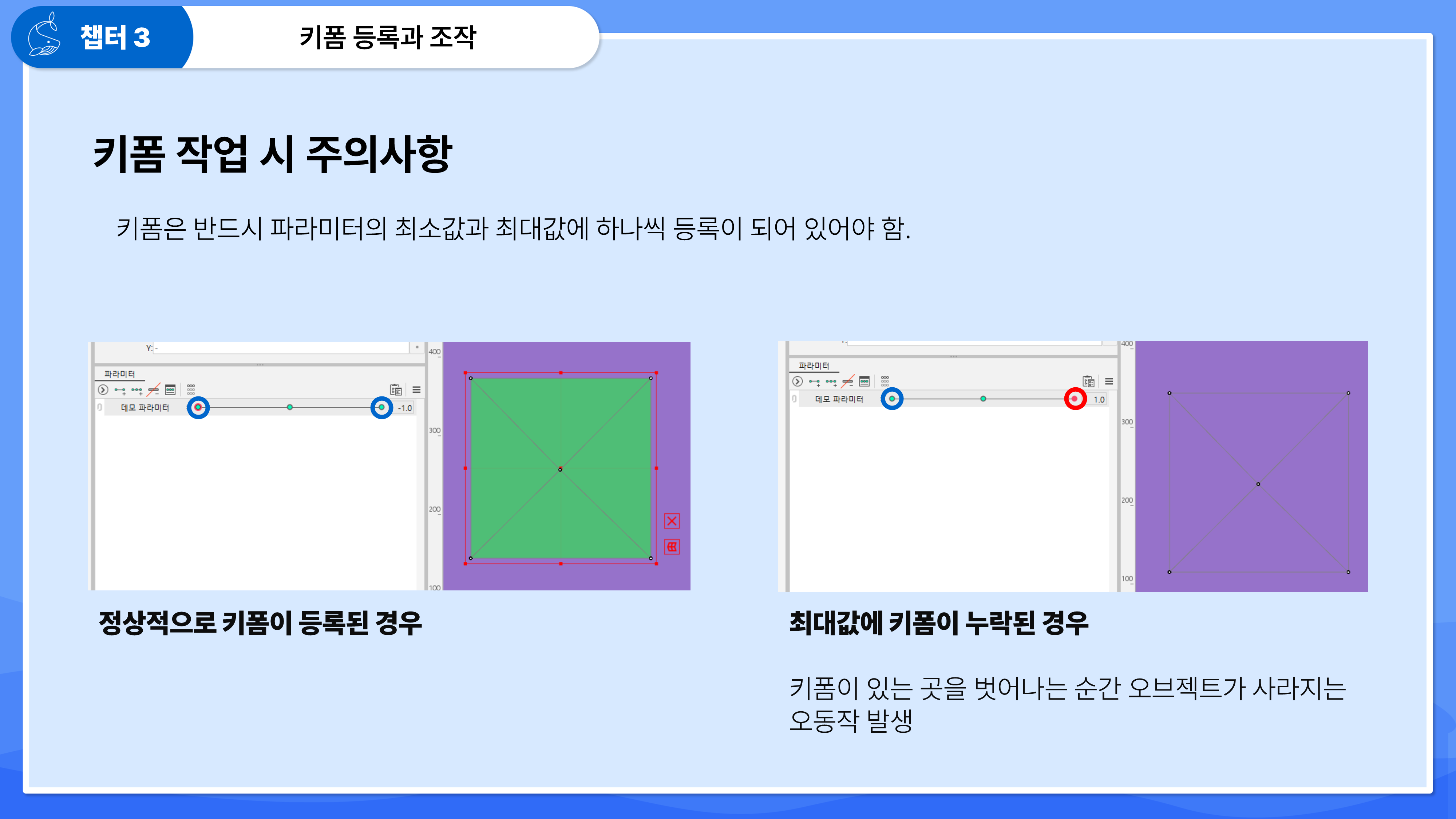 파라미터의 최저값이 키 슬라이더의 좌측에 해당하므로 값이 작아지거나 축소등은 좌측 키폼에 값이 커지거나 확대등은 우측 키폼에 등록하는 것을 권장드립니다.